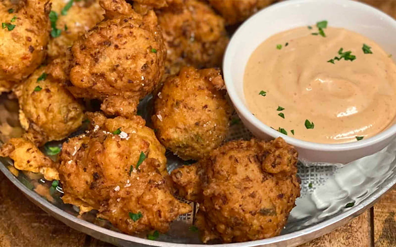 Otra delicia que no puedes perderte son los Conch Fritters, buñuelos dorados fritos rellenos de caracol, pimentón y cebolla, perfectos como aperitivo o acompañamiento con salsas locales.
