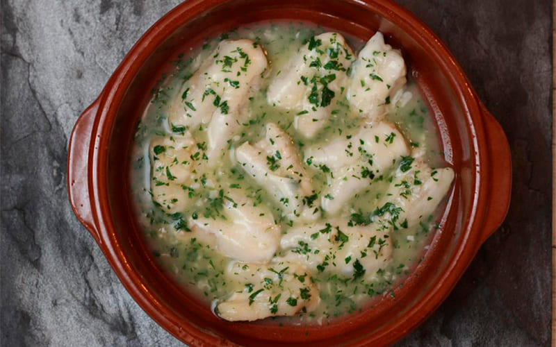 Bacalao al pil pil: Preparación emblemática que combina bacalao, aceite de oliva, ajo y guindilla, logrando una emulsión única.