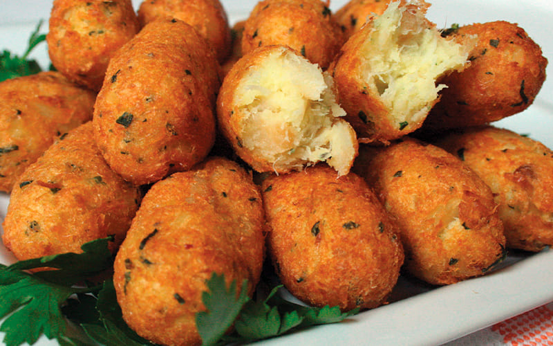 El bacalao es protagonista indiscutible, y los bolinhos de bacalhau son un claro ejemplo. Similares a nuestras croquetas, se preparan con bacalao desmenuzado y papa, y se fríen hasta quedar dorados. Son infaltables en bares y reuniones familiares.