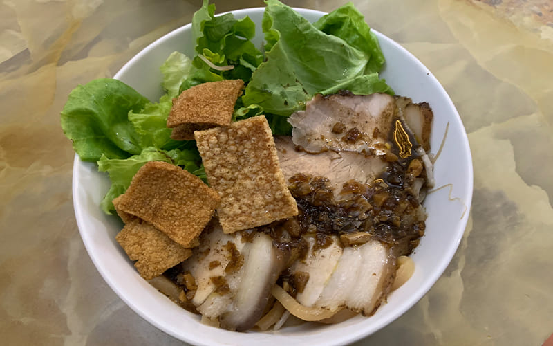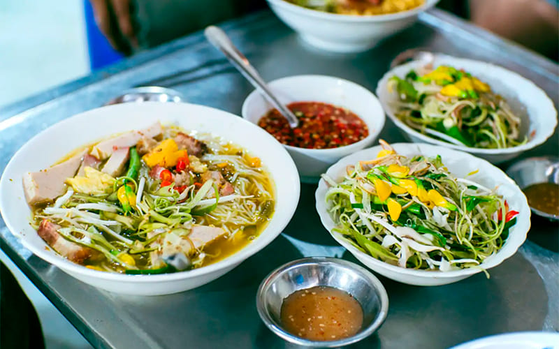 Otro plato tradicional es el cao lau, que combina carne de cerdo, fideos de arroz similares a los soba japoneses y vegetales locales. Existen múltiples versiones, algunas más modernas que incluyen mariscos.