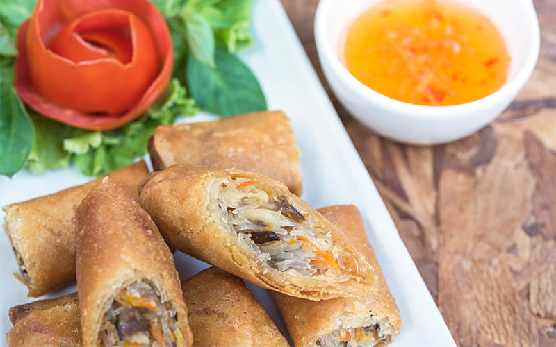 Entre sus preparaciones más conocidas destacan los nems, la versión vietnamita de los rollitos de primavera. Se elaboran con obleas de arroz rellenas de carne de cerdo picada, cebolla, champiñones y col, aunque existen variantes con pollo, cangrejo o camarones. Se fríen en aceite caliente y suelen servirse como entrada.