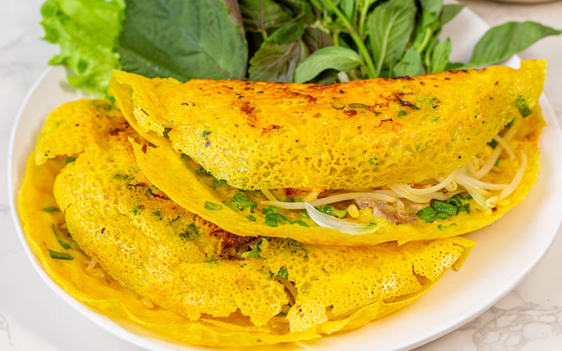Por último, el banh xeo recuerda a los crepes franceses. Se prepara con harina de arroz, agua, leche de coco y cúrcuma, lo que le aporta su color característico. Son ligeros, crujientes y muy aromáticos.