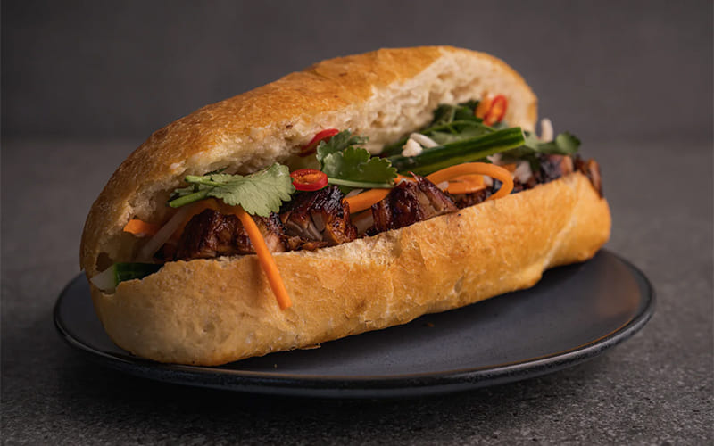 El banh mi refleja la influencia francesa en Vietnam. Es un bocadillo preparado con pan tipo baguette, más liviano y crujiente, elaborado con harina de arroz y trigo, y relleno con carnes, vegetales y diversos aliños.