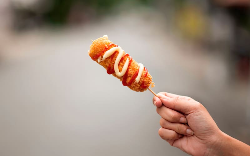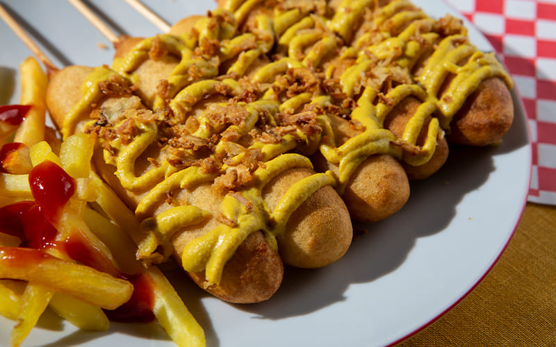 El corn dog, conocido en algunos países como “perro de maíz” o “hot dog empanizado”, es uno de los símbolos más reconocibles de la comida callejera estadounidense. Su origen se remonta a principios del siglo XX, cuando inmigrantes alemanes que se establecieron en Estados Unidos intentaron adaptar sus tradicionales salchichas y embutidos a los gustos locales. En lugar de servirlas con pan, comenzaron a recubrirlas con una masa espesa hecha de harina de maíz y trigo, inspirada en la gastronomía del sur del país. Luego las freían en aceite caliente, creando una cobertura dorada, crujiente por fuera y suave por dentro.