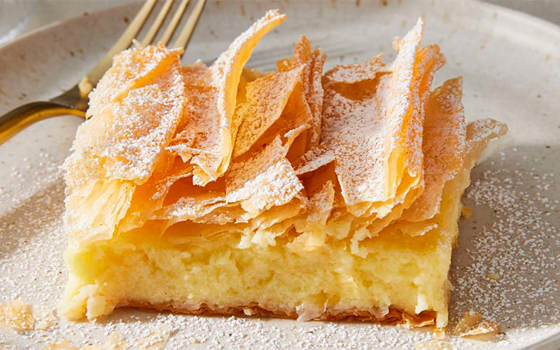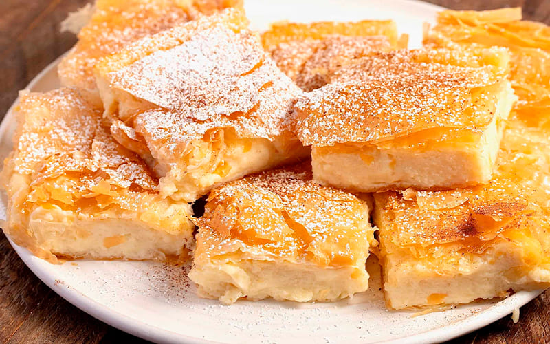 Entre los dulces más queridos de Grecia, la Bougatsa ocupa un lugar especial. Se trata de un pastel crujiente hecho con masa filo, relleno con una suave crema pastelera perfumada con vainilla. Aunque su origen se remonta a la región de Macedonia, este postre se disfruta en todo el país, especialmente en Tesalónica, donde es un clásico del desayuno o la merienda, acompañado de café griego o un vaso de leche fría.
