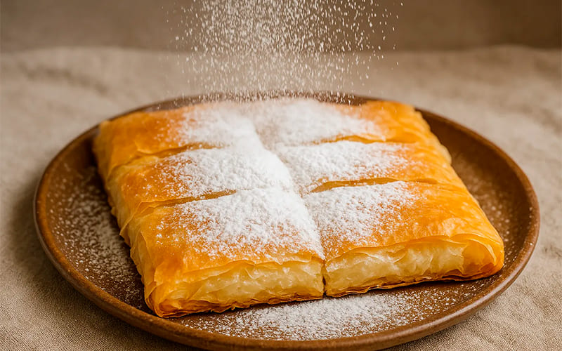 - Dispón los rollos en una bandeja de horno, píntalos con mantequilla y hornea a 180 °C durante unos 20 minutos, hasta que estén dorados. Sirve la Bougatsa espolvoreada con azúcar glas y canela.