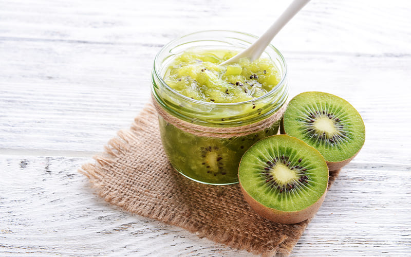 - Incorporar el almíbar caliente a los kiwis y procesar hasta obtener una mezcla homogénea. Colar y reservar.