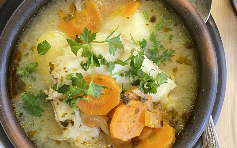 • Sirve bien caliente, espolvoreando perejil fresco por encima. El contraste entre el toque dulce de la fruta y la intensidad del pescado convierte esta sopa en un plato reconfortante y único de la cocina nórdica.