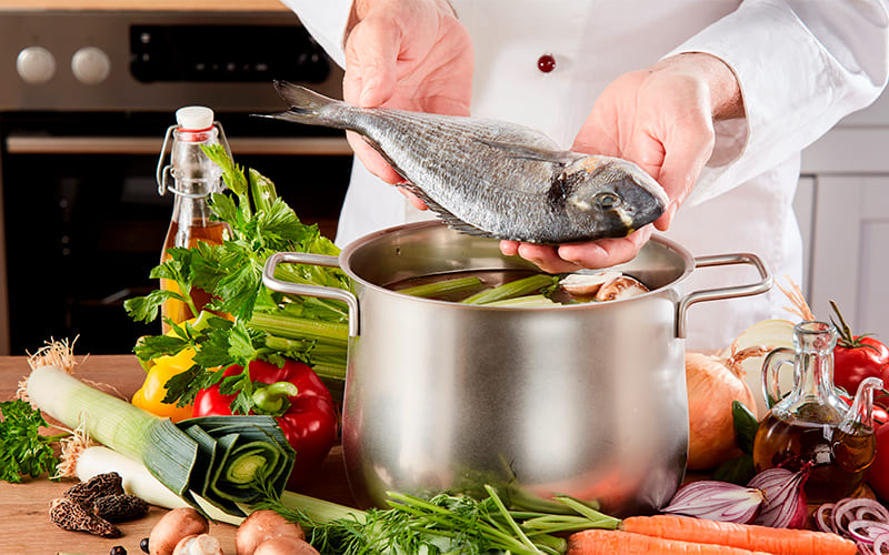 • Saltee estos vegetales en el mismo aceite hasta que comiencen a ablandarse. Incorpore el caldo de pescado, tape la cacerola y cocine a fuego suave durante 20 minutos para concentrar los sabores.